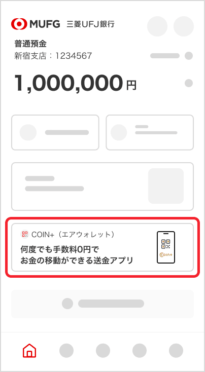 「三菱UFJ銀行」のスマートフォンアプリのトップ画面で銀行口座とCOIN+の残高を同時に確認できます。