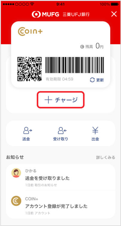 三菱UFJ銀行の口座からCOIN+残高をチャージできます。