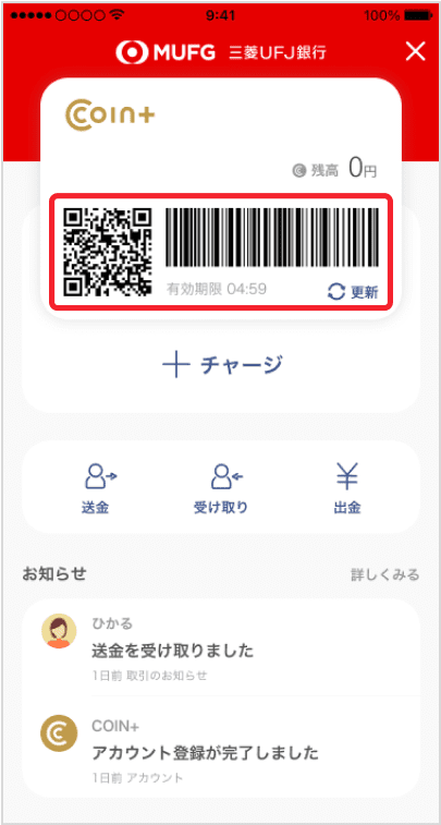 「三菱UFJ銀行」のスマートフォンアプリを起動して、COIN+の画面を見せるとCOIN+残高でお支払いができます。
